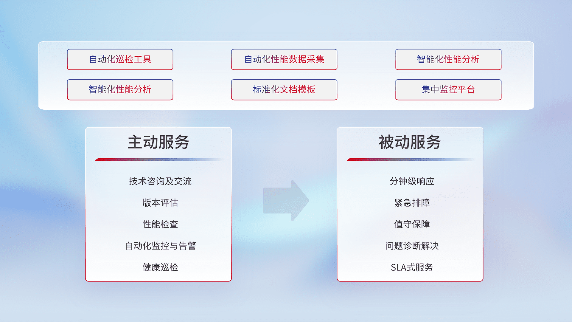 智能化工具和标准化文档,,,,保障服务质量,,,提供主动服务(包含技术咨询、、、、版本评估、、、、性能检查、、、、自动化监控与告警、、健康巡检)和被动服务包含(分钟级响应、、、、紧急排障、、值守保障、、问题诊断解决、、SLA服务)。。。